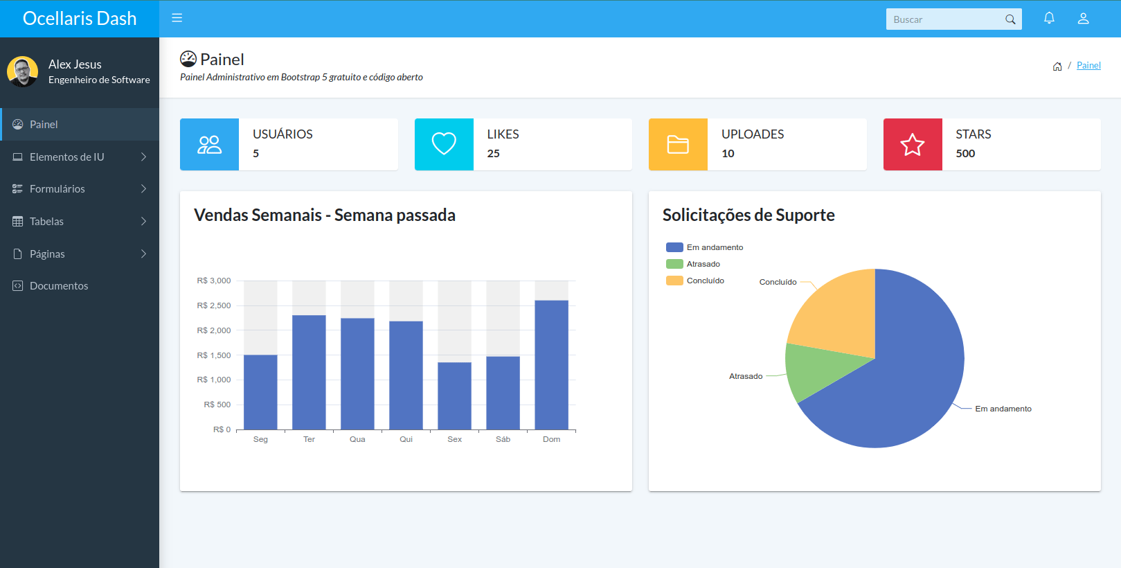 Sete páginas pré-construídas, incluindo login, perfil de usuário e página de fatura para impressão